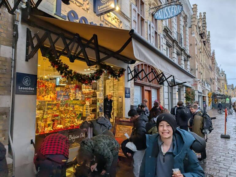 After a filling breakfast the next morning, students had the opportunity to go chocolate shopping in Ypres. After fully stocking up they headed to Langemark, one of five German cemeteries in the area holding approximately 44,000 causalities. Students listened attentively to the story of the first use of chemical weapons and the impact it had.
